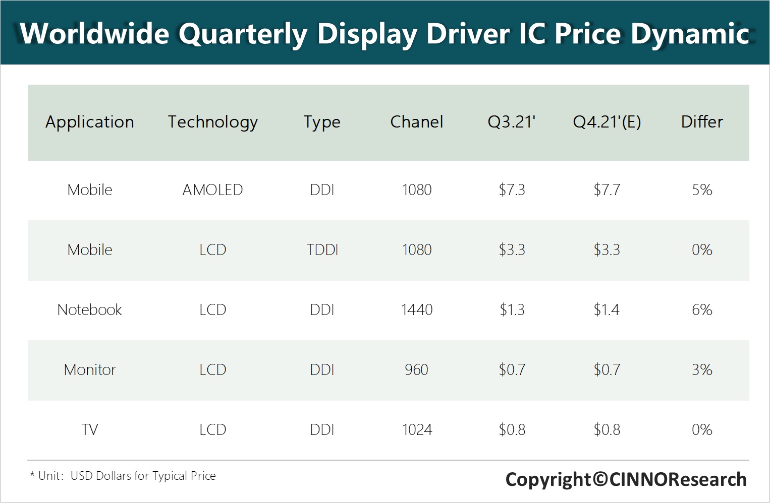 Mobile LCD驱动芯片在持续多月的供应紧缺后有所缓和,TDDI及外挂IC需求满足度回升,价格趋于稳定,一方面因合肥晶合产线新增晶圆代工产能持续开出,第四季度芯片价格趋于稳定;