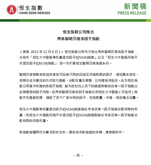 智通财经APP获悉,12月6日,恒生指数公司推出两条聪明贝塔多因子指数,分别为“恒生大中型股等权重混合因子(QVLM)指数”以及“恒生大中型股风险平价混合因子(QVLM)指数”,进一步扩展恒生聪明贝塔指数系列。