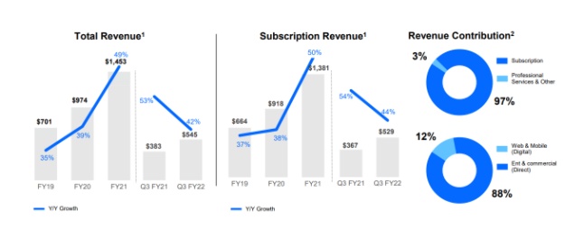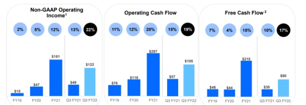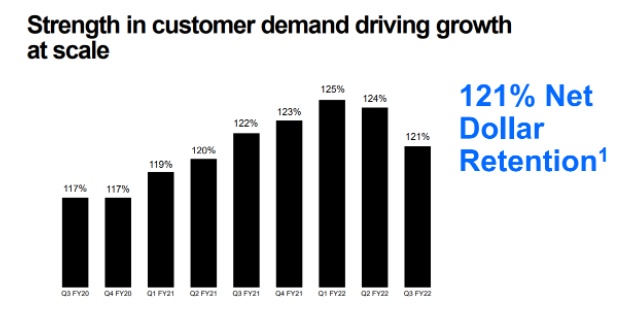 该公司22财年第二季度的NDR率已经下降了1pp,降至124%。而22年财年第三季度中,NDR率又下跌了3个PP,降至121%,这意味着现有的客户正在放缓其支出。再加上用户注册量和收入增长的放缓,这一点不得不让人令人担忧。