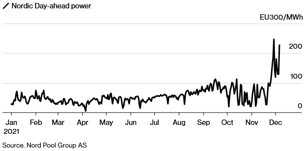 其中,瑞典北部气温降至零下40摄氏度以下,北欧地区周一电价攀升至每兆瓦时226.54欧元,为历史第二高水平;瑞典为了维持电网平衡启动了一个燃油储备发电厂。此外,波兰电价上涨69%至每兆瓦时240.59欧元,是今年2月北欧电力交易所开始拍卖以来的最高水平;德国电价升至每兆瓦时265.39欧元、法国电价升至每兆瓦时282.50欧元,接近今年初秋以来的高点。