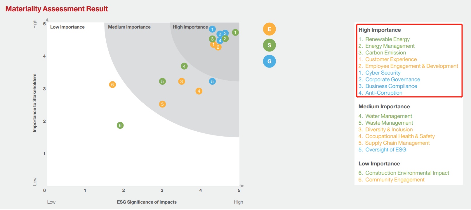 基于此,万国数据联合外部第三方专业咨询公司进行了长时间的讨论和评估。为制定ESG战略,万国数据首先确定了影响公司可持续发展的关键点,同时评估了政府政策或监管的要求,从而根据重要程度梳理了各方向的发力点以及实施的优先级。