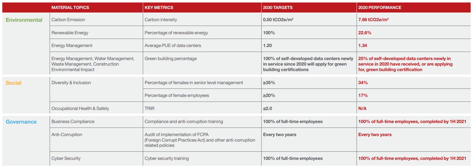 在此基础上,万国数据将重要程度最高的方向做了详细落实计划,并制定了明确目标。环境方面,2030年碳排放将降至零,截至2020年的碳排放强度为每平方米7.66吨;可再生能源百分比将从2020年的22.6%提升至2030年的100%;。社会与治理方面则由于万国数据过往的持续努力,目前已经达成的成绩与2030年的目标水平已相对接近。