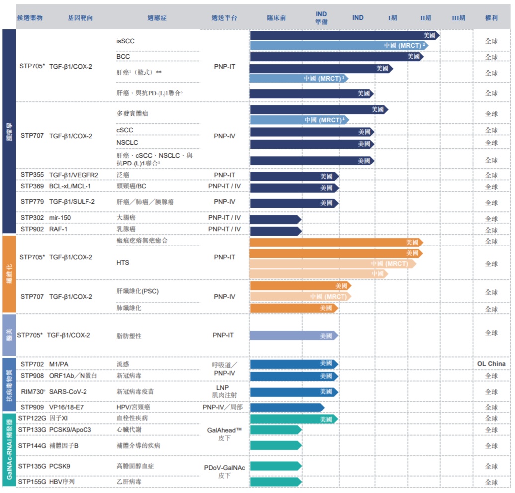 此外,主要候选产品STP707是一种使用Sirnaomics PNP递送平台的双重TGF-β1/COX-2抑制剂。Sirnaomics于2021年11月在美国启动实体瘤I期临床试验并计划于中国提交IND进行HCC的I期临床试验,作为全球多中心试验的部分。Sirnaomics亦计划于2021年下半年于美国提交PSC(肝纤维化罕见形式)的IND。