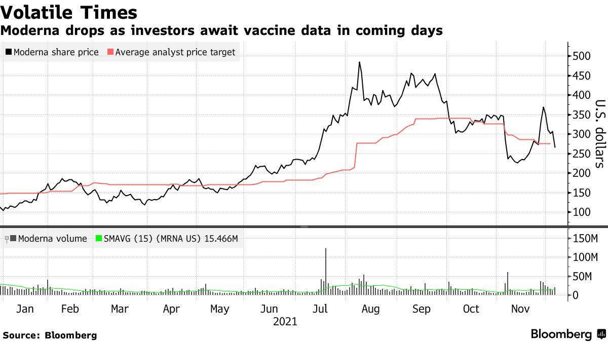 在现有新冠疫苗对奥密克戎(Omicron)变异病毒抵抗效力的研究结果出炉之前,市场非常有默契地“先抛为敬”,目前Moderna的股价已经跌破最新统计的分析师平均目标价格。