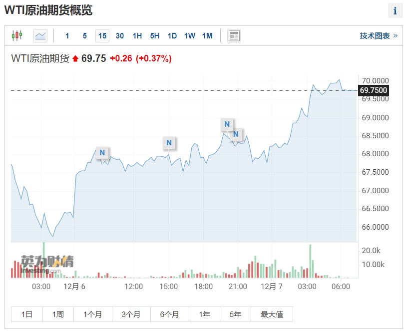 受多重利好消息提振,WTI原油期货周一收涨4.9%,报69.49美元/桶;布伦特原油期货收涨4.6%,报73.80美元/桶,此前这两个基准原油价格连续6周下跌。截止发稿,WTI原油期货跌0.46%,报69.73美元/桶;布伦特原油期货跌0.07%,报73.58美元/桶。