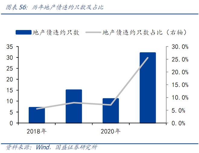 据国盛证券统计,今年前三季度,已有32只地产债违约,涉及发行主体13个,共计规模412.5亿元。相比2020年,今年以来地产债信用事件数量增长显著,促使地产债信任危机达到高点。