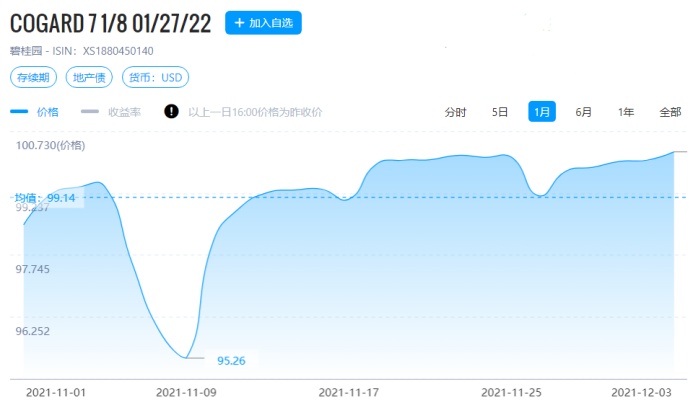 据智通财经APP了解到,自此轮地产债违约潮后,碧桂园美元债价格于10月及11月受行业市场情绪影响各出现过1次下跌,而于近1个月以来迅速反弹。目前,公司债券价格除11月底出现小幅波动外,现已整体恢复并维持在历史高位。