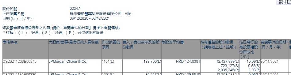智通财经APP获悉,香港联交所最新资料显示,11月30日,小摩增持泰格医药(03347)18.37万股,每股作价124.8381港元,总金额约为2293.28万港元。增持后最新持股数目约为1242.8万股,最新持股比例为10.09%。