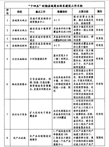 围绕“到2025年,在具备条件的地区,基本实现县县有连锁商超和物流配送中心、乡镇有商贸中心、村村通快递”的目标,以县乡村商业网络体系和农村物流配送“三点一线”为重点,以渠道下沉和农产品上行为主线,加快推动县域商业网点设施、功能业态、市场主体、消费环境、安全水平等的改造升级。到2025年,建立以县城为中心、乡镇为重点、村为基础、分工合理、布局完善的一体化县域商业网络体系。
