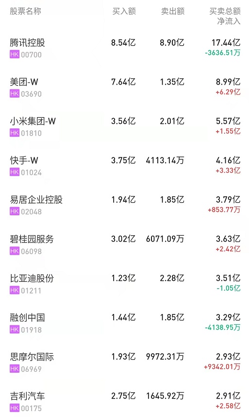 此外,碧桂园服务(06098)、易居企业控股(02048)分别获净买入2.41亿、8537万港元。而长城汽车(02333)、药明生物(02269)分别遭净卖出3.29亿、1.4亿港元。