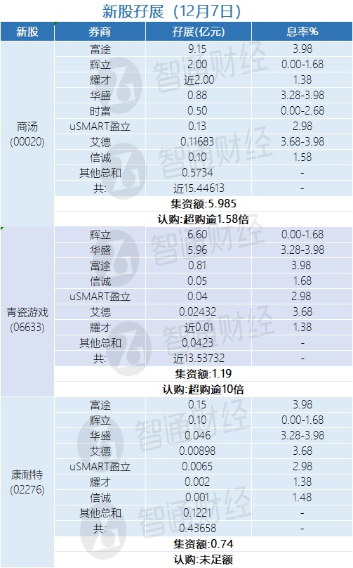 智通财经APP获悉,商汤(00020)、青瓷游戏(06633)、康耐特(02276)正在招股中。截至12月7日,富途、华盛、辉立等合计分别为其借出孖展近15.44613亿港元、近13.53732亿港元、0.43658亿港元,其中商汤超逾购1.58倍,青瓷游戏超购逾10倍,康耐特未足额。