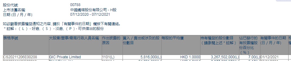 智通财经APP获悉,香港联交所最新资料显示,12月1日,GIC Private Limited增持中国铁塔(00788)581.6万股,每股作价1港元,总金额为581.6万港元。减持后最新持股数目约为32.68亿股,最新持股比例为7%。