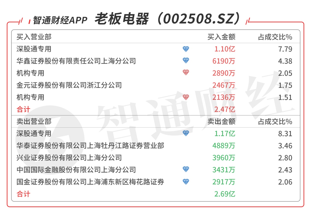 老板电器(002508.SZ):多主力现身龙虎榜,机构席位买入5026万元,深股通对倒,买二是知名游资的席位买入6190万元,当日买卖均衡,该股今日放量突破60日线涨停,预计压力位在半年线附近。