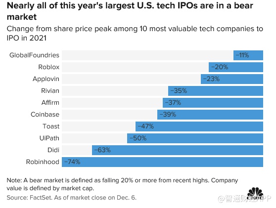 这意味着其余的新上市公司处于熊市区域,即股价较峰值下跌20%或以上。 其中10家公司仅在上周就至少下跌了 20%。