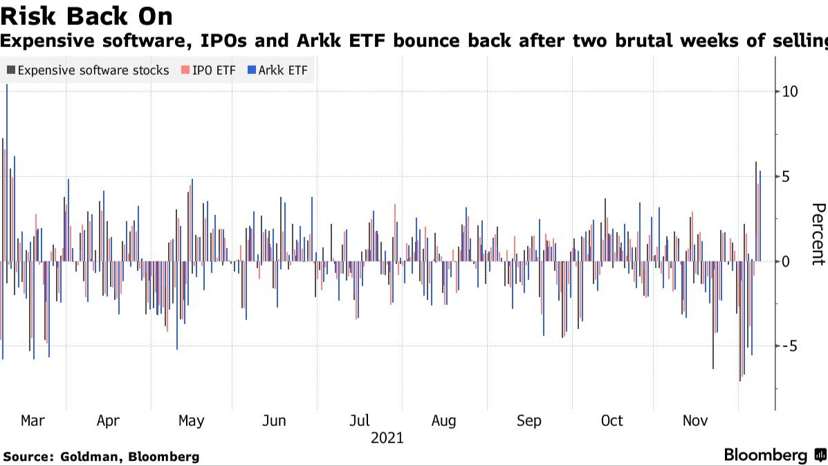 Richard Bernstein Advisors副首席投资官Dan Suzuki表示:"显然,风险偏好正在反弹,因投资者似乎对Omicron的担忧有所减轻。"“我猜,这是你看到的正常的逢低买进心态的一部分,因为信徒们看到自己喜欢的股票开始折价出售。”