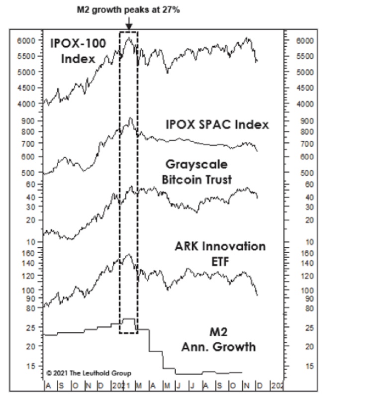 Leuthold Group的首席投资官Doug Ramsey跟踪了货币供应量的增长率,如美国政府的M2账户所示,以及从新发行股票到比特币和ARKK等投机资产的表现。他发现它们的增速同时在2月达到峰值。