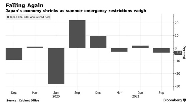 日本内阁府周三公布的修正数据显示,截至9月的三个月内,日本国内生产总值(GDP)折合成年率后减少3.6%,在过去八个季度中有五个季度出现了萎缩。经济学家此前预计整体经济下滑3.1%,而政府最初预期为3%。