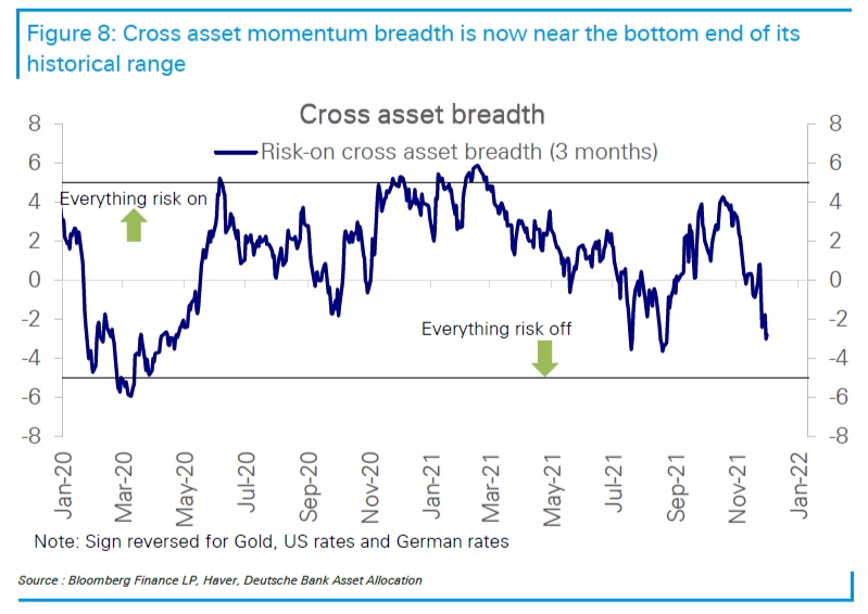 与此同时,德意志银行的跨资产动量指标 (cross-asset momentum measure) 则显示风险资产可能正在触底,虽然仍为负值,但该指标已接近历史低点。