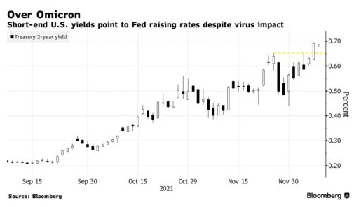 由于投资者对新冠病毒变种的担忧减弱,美国2年期国债收益率周二收于0.69%,为2020年3月以来的最高水平,较上周低点反弹了约25个基点。基准10年期国债收益率仍比感恩节高点低20多个基点。