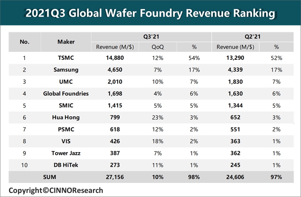 在全球半导体行业景气度高涨的背景下,2021年第三季度全球主要晶圆代工厂营业收入纷纷创下新高,根据CINNO Research数据显示,前十大晶圆代工厂营收总额约为272亿美元,环比提升约10%,营收环比平均增幅约为11%。