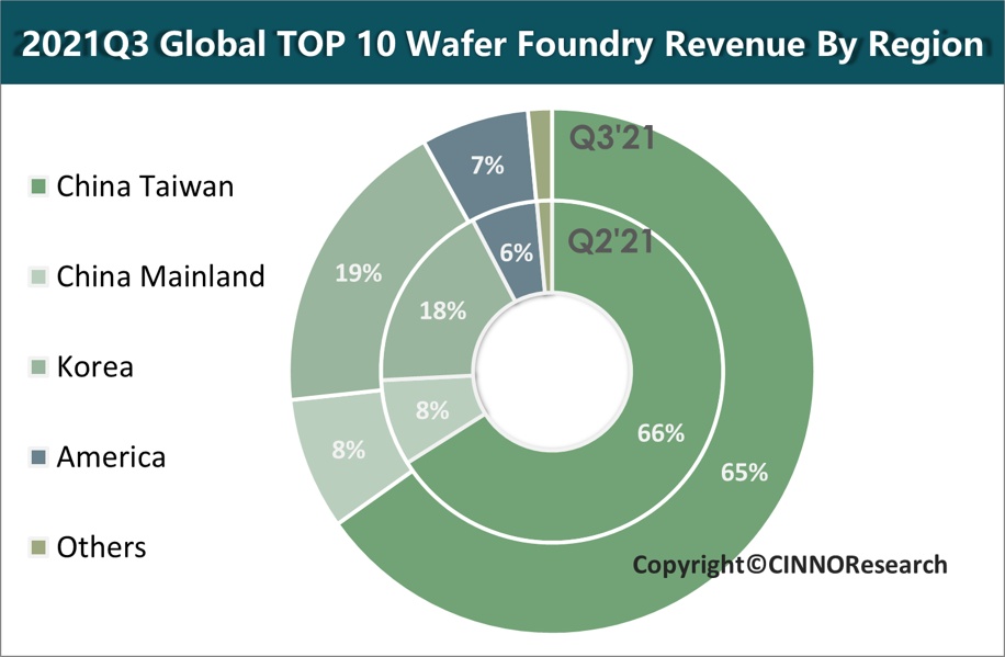 按照厂商所属地域别统计,2021年第三季度在全球前十大晶圆代工厂中,中国台湾厂商营收占比约为65%,环比下降约1个百分点,中国大陆厂商营收占比约为8%,环比持平,韩国厂商营收占比约为19%,环比提升约1个百分点,整体看来,全球晶圆代工市场区域分布结构稳定。在国内半导体扩产力度激增的影响下,2022年国内晶圆厂将进入密集投片期,但由于台积电领跑先进制程并具有定价权,明年依然为中国台湾地区晶圆厂独大的竞争格局。