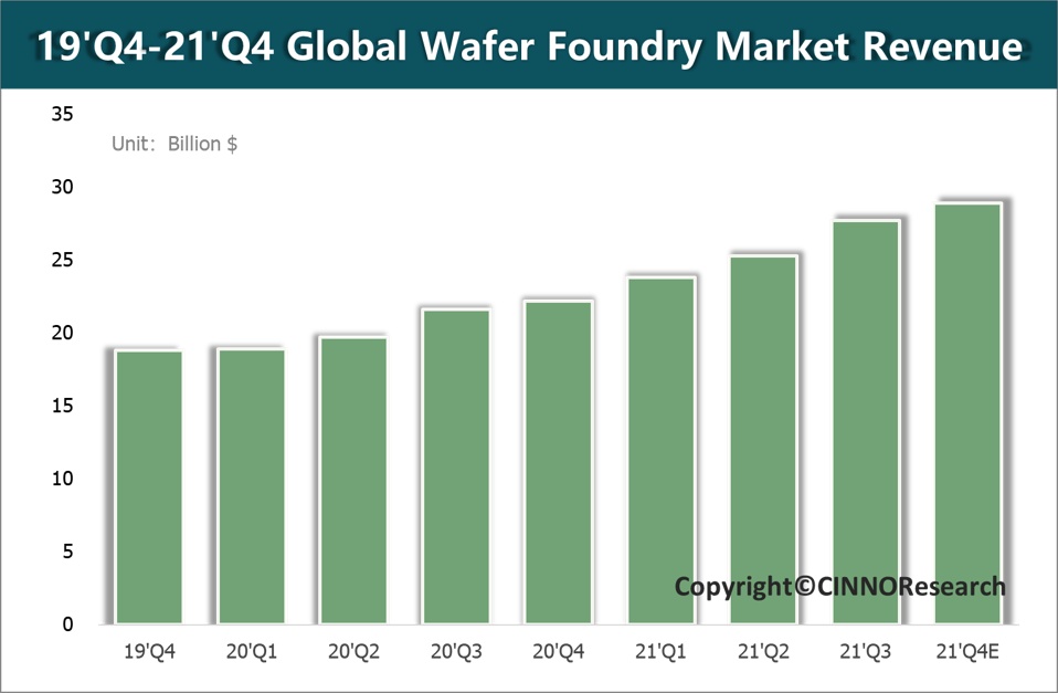 智通财经APP获悉,CINNO Research发布研究报告称,“2021年第三季度全球主要晶圆代工厂持续满载,晶圆代工厂营业收入创下新高,毛利率保持高水平。CINNO Research预测,2021年全球晶圆代工市场营收规模预计为1,057亿美元,较2019年增长28%。”