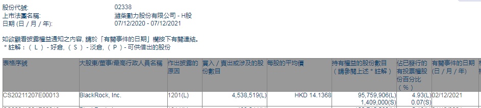 智通财经APP获悉,联交所最新资料显示,12月2日,贝莱德减持潍柴动力(02338)453.8519万股,每股作价14.1368港元,总金额约为6416.01万港元。减持后最新持股数目约为9575.99万股,最新持股比例为4.93%。