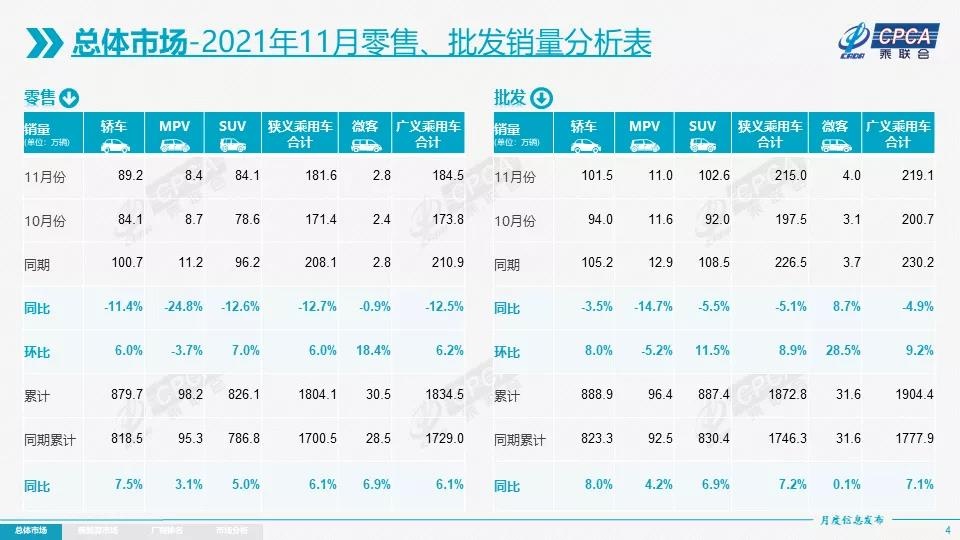 零售:2021年11月乘用车市场零售达到181.6万辆,同比下降12.7%,相较2019年11月下降6%,11月零售总体不强。