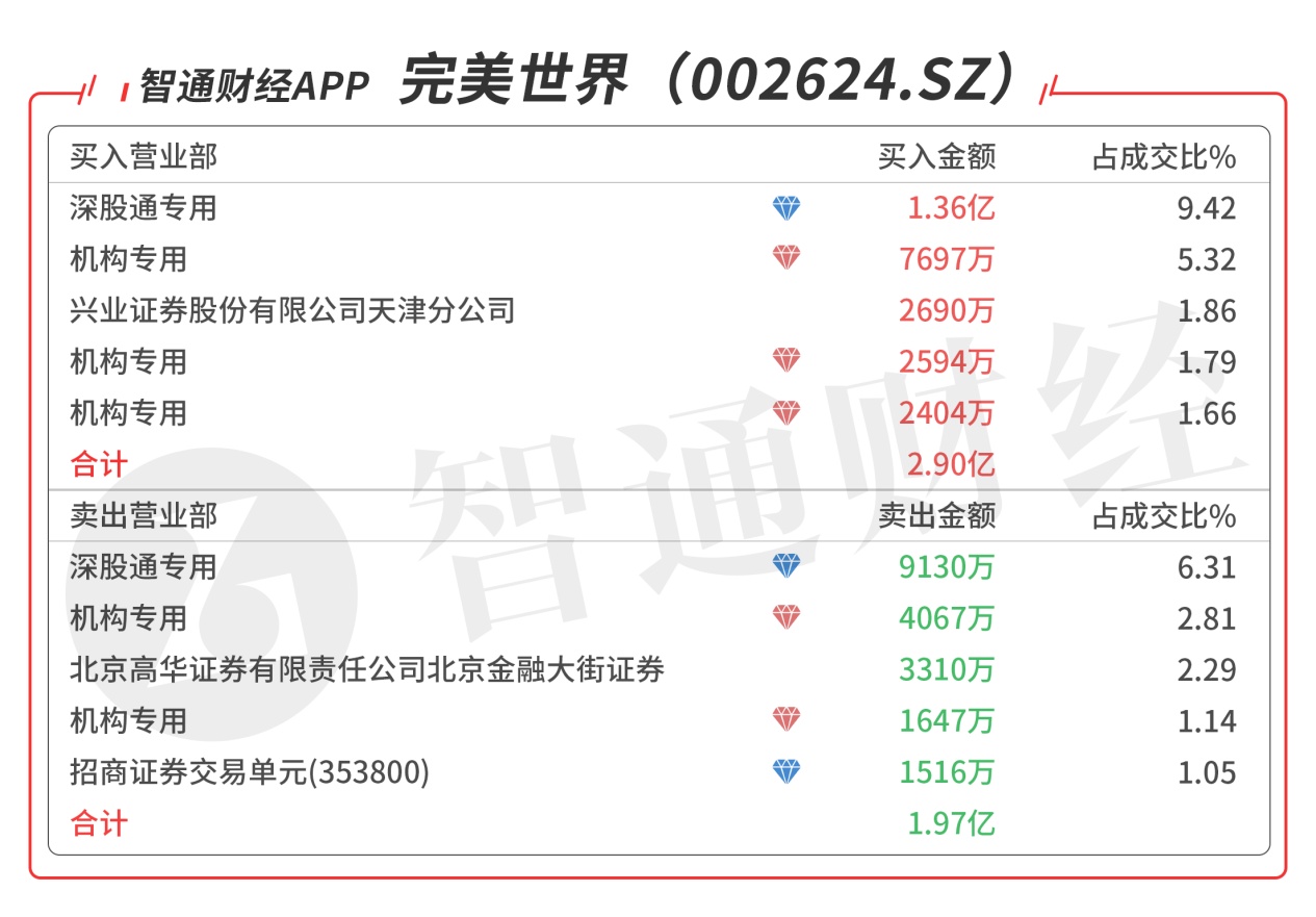 完美世界(002624.SZ):受到众多机构青睐,今日共三个机构席位出现在龙虎榜单上,分别列买二,买四,买五,合计买入1.27亿元,深股通对倒净买入4502万元,当日净买入1.02亿元,该股近期调整充分,今日强势涨停到了年线附近,预计有溢价。