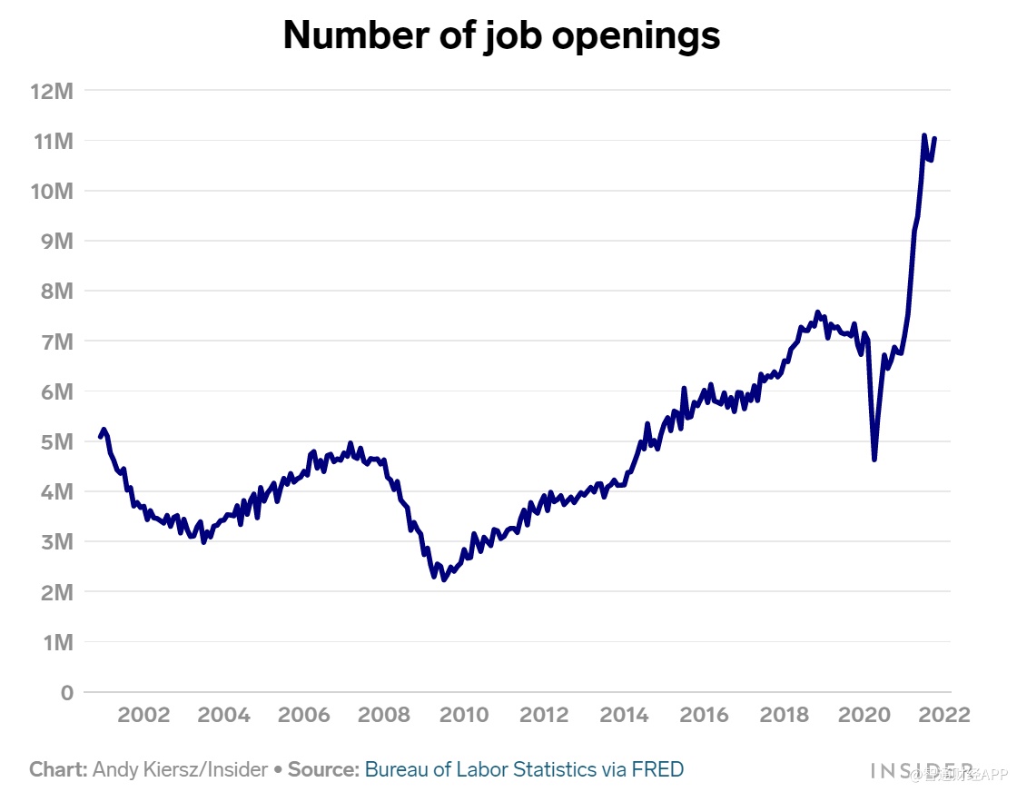 美国劳工统计局的单独数据显示,10月份有740万美国人失业,远低于职位空缺总数。通常情况下,这些数字是比较接近的,但目前有数百万美国人正选择留在劳动力市场外观望。