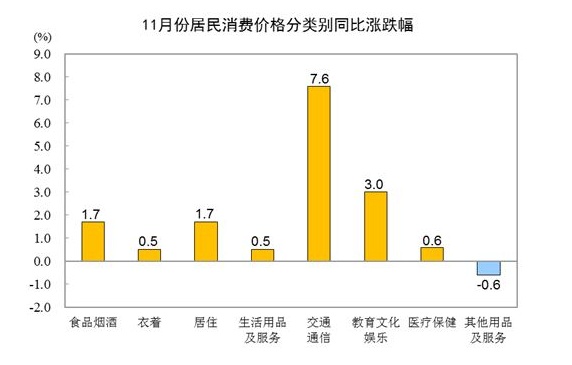11月份,食品烟酒类价格同比上涨1.7%,影响CPI(居民消费价格指数)上涨约0.49个百分点。食品中,鲜菜价格上涨30.6%,影响CPI上涨约0.60个百分点;蛋类价格上涨17.6%,影响CPI上涨约0.10个百分点;水产品价格上涨8.5%,影响CPI上涨约0.15个百分点;鲜果价格上涨4.1%,影响CPI上涨约0.07个百分点;粮食价格上涨1.5%,影响CPI上涨约0.03个百分点;畜肉类价格下降19.7%,影响CPI下降约0.81个百分点,其中猪肉价格下降32.7%,影响CPI下降约0.68个百分点。