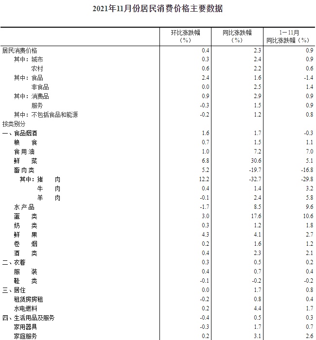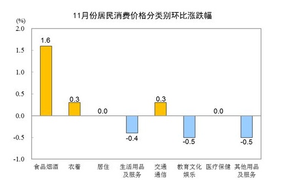 11月份,全国居民消费价格环比上涨0.4%。其中,城市上涨0.3%,农村上涨0.6%;食品价格上涨2.4%,非食品价格持平;消费品价格上涨0.9%,服务价格下降0.3%。