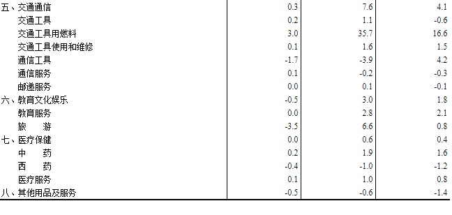 其他七大类价格同比六涨一降。其中,交通通信、教育文化娱乐、居住价格分别上涨7.6%、3.0%和1.7%,医疗保健、衣着、生活用品及服务价格分别上涨0.6%、0.5%和0.5%;其他用品及服务价格下降0.6%。