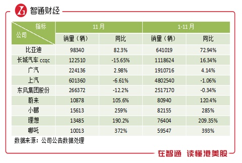 在传统车企中,比亚迪(01211)仍销量持续领跑,11月销量98340辆,同比增长82.3%,其中新能源车占比提升至92.8%,1-11月销量641019辆,同比增长72.94%。上汽、广汽及长城的新能源车后来居上,11月销量分别为8.23万辆、1.78万辆及1.61万辆,1-11月,上汽销量63.82万辆,市场份额跃居第一,广汽及长城均超10万辆。