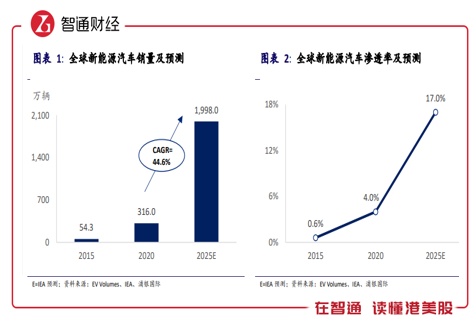 从全球范围看,在“碳中和”共识下,新能源汽车获得世界各国的政策扶持,在今年首三季度,全球新能源车销量同比增长138%。目前欧洲及中国为新能源车的主战场,根据IEA的预测,到2025年,全球新能源汽车的销量将达到1998万辆,渗透率17%,五年复合增长率为45%。