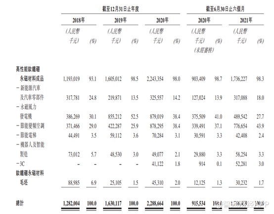 从产品上来看,金力永磁的产品主要包括高性能钕铁硼永磁材料成品,2018年至2021年H1的收入占比分别为93.1%、98.5%、98%及98.3%。除此以外,公司也可以根据客户订单生产及销售若干定制钕铁硼永磁材料毛坯。不过,该类产品营收占比较小,2018年至2021H1,其营收占比分别为6.9%、1.5%、2.0%及1.7%。