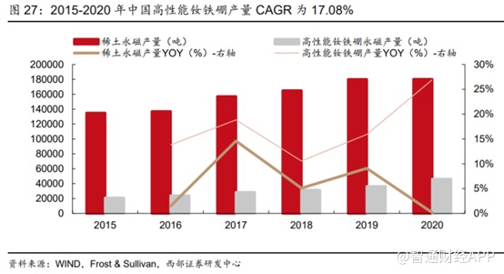 国内所产稀土永磁体中,高性能钕铁硼近年产量快速提高。2013-2014年间,国内有8家永磁材料公司获得日立金属专利授权。2014年7月,日立金属拥有的钕铁硼成分专利均到期。2015-2020年国内高性能钕铁硼产量CAGR达到17.08%,远高于稀土永磁体总产量CAGR值5.96%。