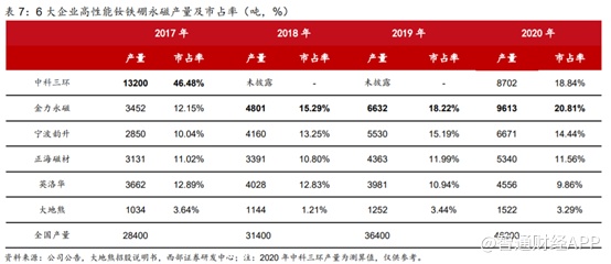 高技术壁垒构成行业护城河,生产高性能钕铁硼永磁材料的企业集中度较高。国内最早从事钕铁硼磁性材料研发和生产的企业中科三环,当时拥有先发优势,其2017年市占率达到46.48%。金力永磁大幅扩产,市占率后来居上。业内突破高性能钕铁硼技术限制后,叠加下游需求放量,多家企业进行扩产,2020年全国高性能钕铁硼产量达到4.62万吨,中科三环、金力永磁等6家合计生产高性能钕铁硼(磁钢成品)约3.64万吨,合计市占率78.79%。其中金力永磁近几年大幅扩产且接近满产状态,2020年国内市场市占率达到了20.81%,国内排名第一。