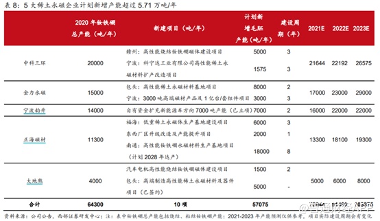 随着下游需求不断提升,行业也在大力扩张产能,其中有多项新建项目明确专注“新能源汽车”应用领域磁材。据不完全统计,目前5家稀土永磁公司共计10项新投项目正在推进,合计计划产能接近6万吨/年。假设所有项目按计划达产,2022年国内将有三家企业钕铁硼产能超过2万吨/年。西部证券预估金力永磁钕铁硼产能将在2022年赶超中科三环,并在2025年达到40000吨/年。