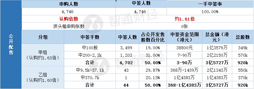 其中,公开配售申购人数4746人,一手中签率100%,认购倍数约1.61倍。