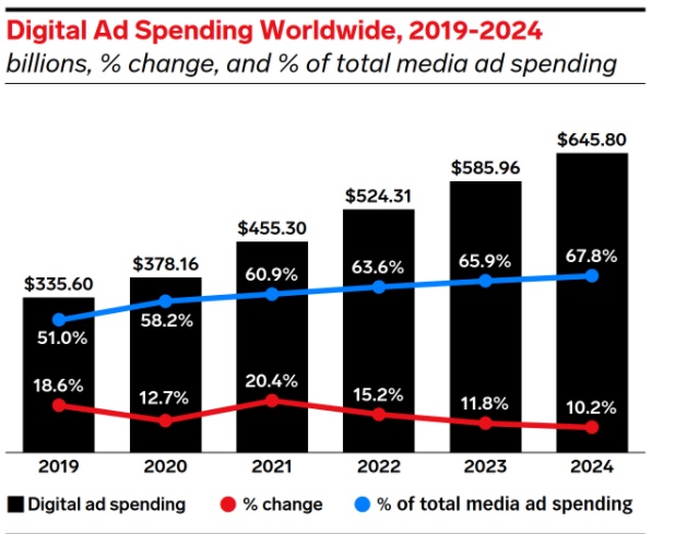 鉴于数字广告支出已经非常庞大,而且在人们由于疫情所导致的居家隔离的推动下,预计支出还会继续增长。根据上图,数字广告支出预计将从2021年的约4500亿美元增长至2024年的近6500亿美元,这意味着将获得2000亿美元的新广告收入。