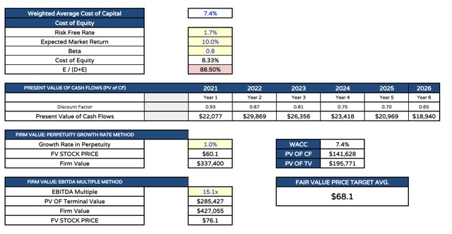 通过DCF模型得出的目标估值为60美元,较当前股价上涨约15%;通过EBITDA估值模型得出的目标估值则为76美元,意味着有45%的上涨空间。两者的平均值为68美元,对应着较当前股价约30%的涨幅,这个数字处在合理范围内。