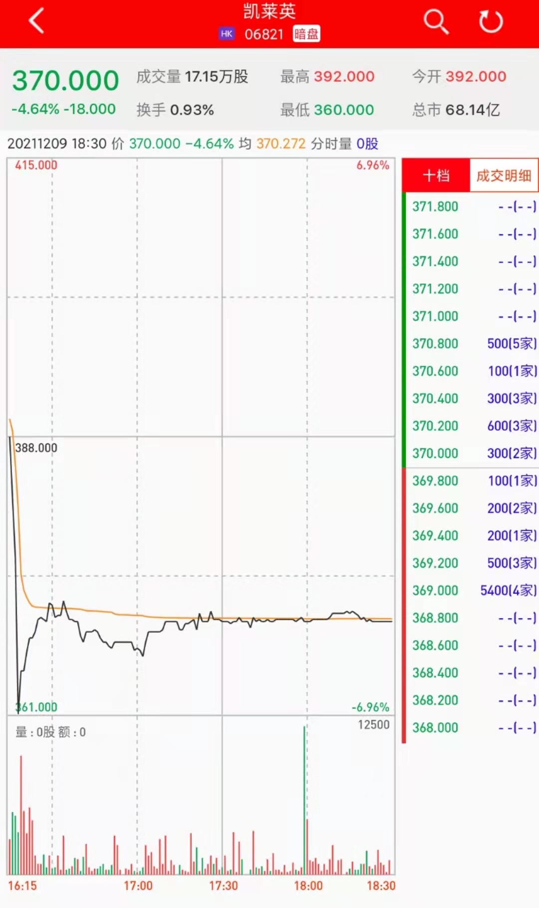 智通财经APP获悉,凯莱英(06821)将于12月10日(星期五)在香港挂牌。截至收盘,利弗莫尔证券暗盘交易显示报价370港元,较招股价388港元跌4.64%。每手100股,不计手续费,每手亏1800港元。