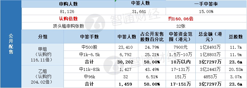 其中,公开配售申购人数81126人,一手中签率15%,认购倍数约160.06倍。