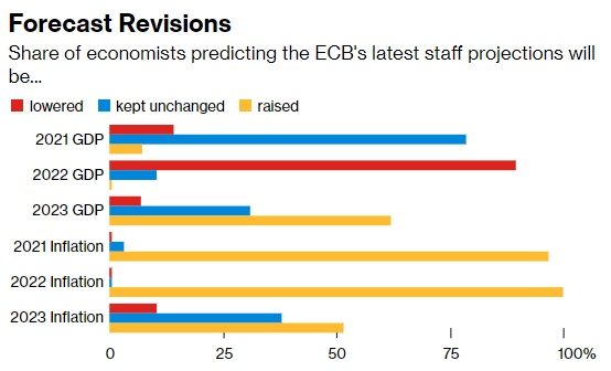 经济学家们表示,欧洲央行将上调通胀预期,同时预计明年的经济增长前景将被下调。9月份,欧洲央行预计,2022年通胀率将降至1.7%,2023年降至1.5%。