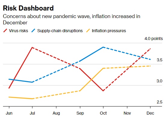 然而,在通胀高企的同时,欧洲新一波确诊人数的激增和omicron异株的出现使经济情况变得不明朗。