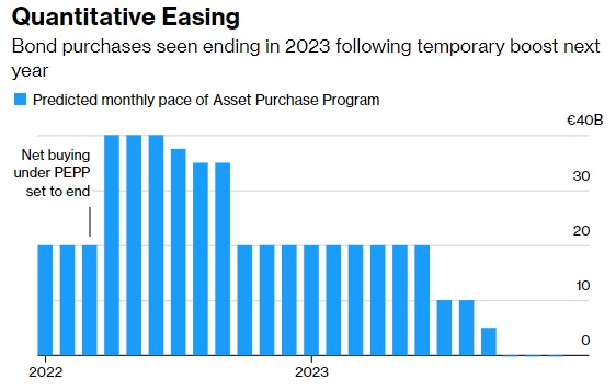 智通财经APP获悉,据Bloomberg对经济学家进行的调查,欧洲央行将寻求缓冲明年退出紧急抗疫购债计划(PEPP)的情况,以免通胀前景走强导致2023年结束所有量化宽松政策。调查显示,预计决策者下周四将决定于明年3月份停止1.85万亿欧元(合2.1万亿美元)的PEPP,暂时加快其常规购债计划(APP)的步伐,以减轻影响。将近一半的受访者预计明年将出现10多年来的首次加息。
