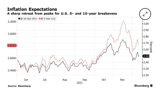 美国5年和10年的盈亏平衡利率从峰值大幅回落(中长期通胀下跌)