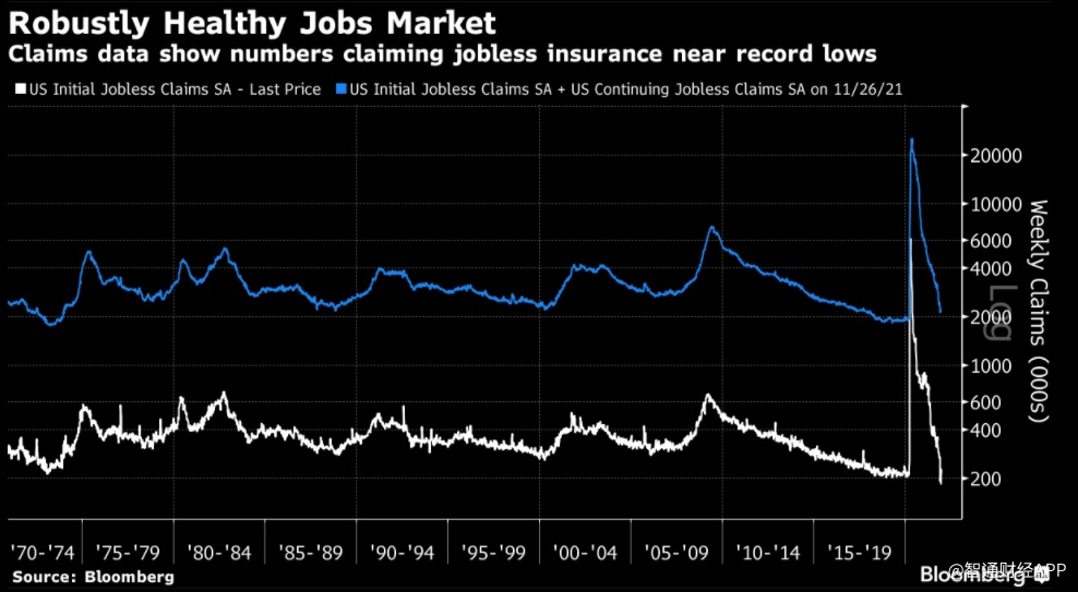 据美国劳工部数据显示,美国截至12月4日当周初请失业金人数为18.4万人,降至1969年以来的最低水平。截至11月27日当周续请失业金人数为199.2万人,也几乎降到了疫情前的水平。