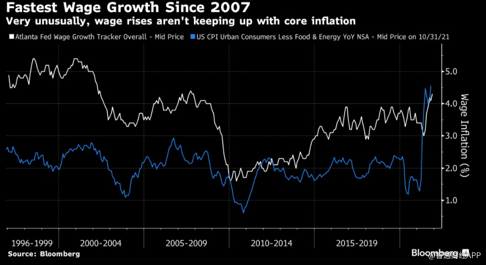 在这方面,亚特兰大联邦储备银行编制的“工资增长追踪指标”(Wage Growth Tracker)显示,总体工资增长速度是2007年以来最快的。 但工资增幅低于核心通胀,因此工人有动力争取更高工资: